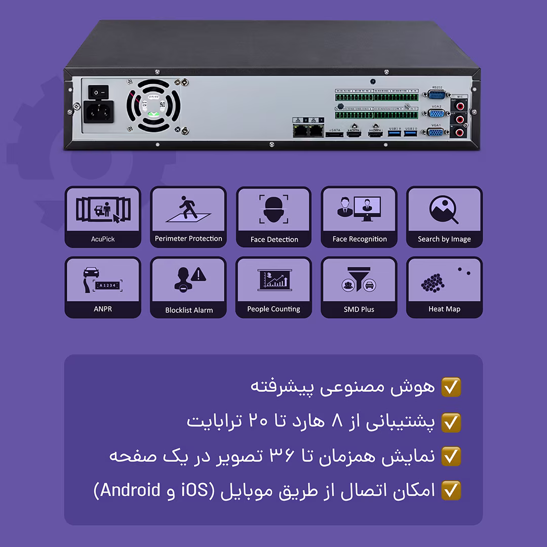 دستگاه ان وی ار ۳۲ کانال داهوا مدل DHI-NVR5832-EI با طراحی 2U رکمونت و پشتیبانی از خروجیهای HDMI و VGA، امکان مشاهده تصاویر با کیفیت بالا را فراهم میکند. امکانات هوش مصنوعی مانند تشخیص چهره و ANPR، امنیت و کارایی سیستم را به طور چشمگیری افزایش میدهد. همچنین، با پشتیبانی از AcuPick، جستجوی هوشمند تصاویر را امکانپذیر میکند.