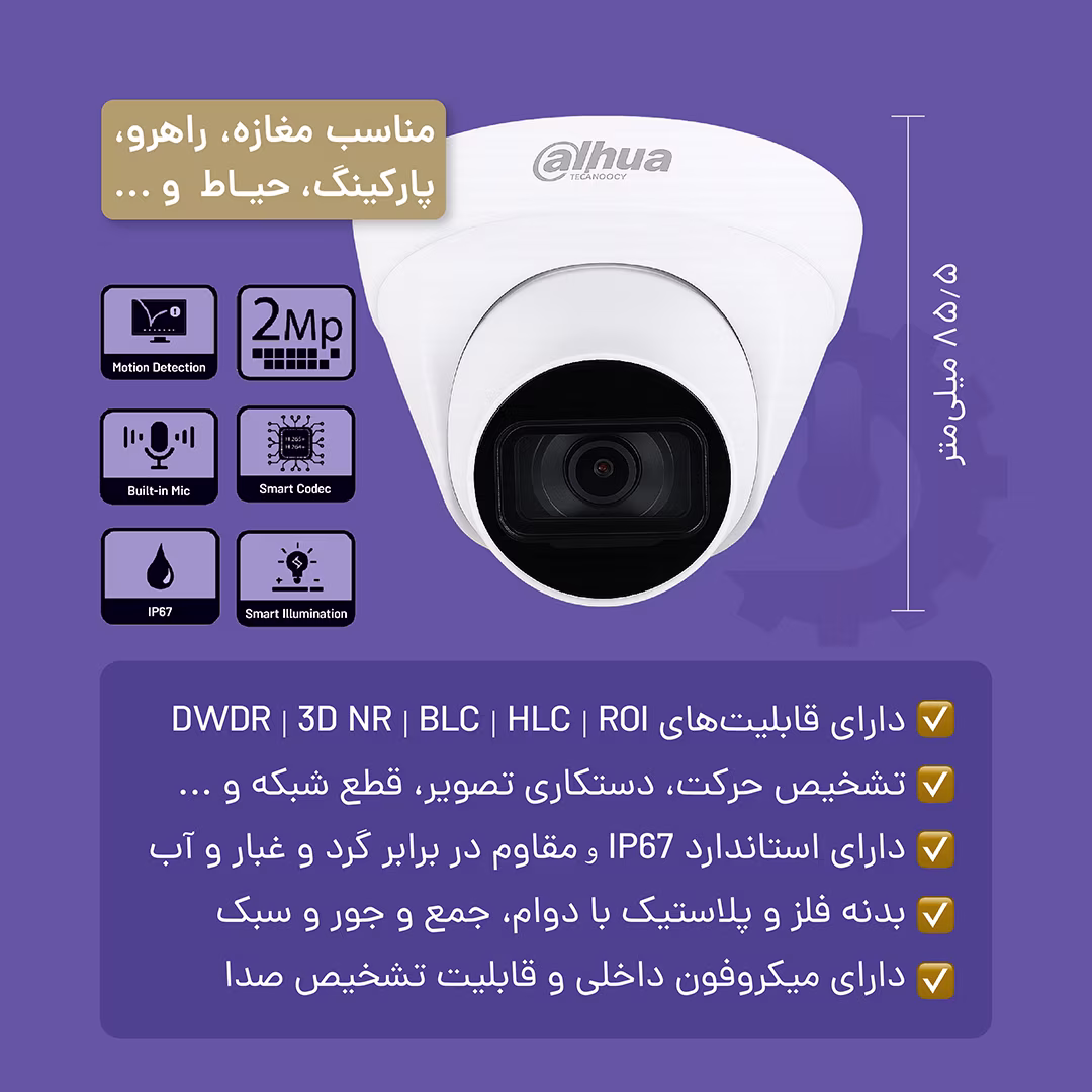 داهوا توی این مدل از سنسور ۲ مگاپیکسلی استفاده کرده که توی محیط داخلی و حتی نیمهروشن هم کیفیت مناسبی ارائه میده. یکی از مزیتهای مهمش، میکروفون داخلی هست که صدای محیط رو همزمان با تصویر ضبط میکنه؛ چیزی که تو خیلی از مدلهای همقیمت نمیبینی.